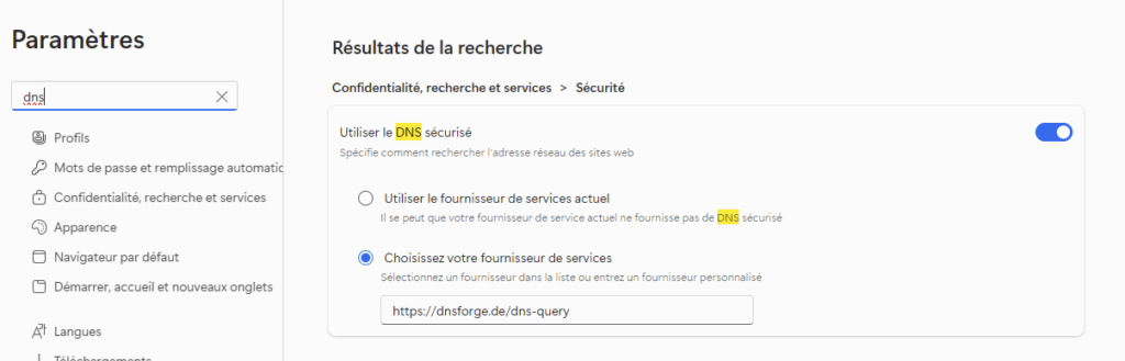 - choisissez un fournisseur qui filtre ce que vous souhaitez ; personnellement j’utilise soit DNSForge.de (https://dnsforge.de/dns-query), soit Mullvad-Base (https://base.dns.mullvad.net/dns-query).